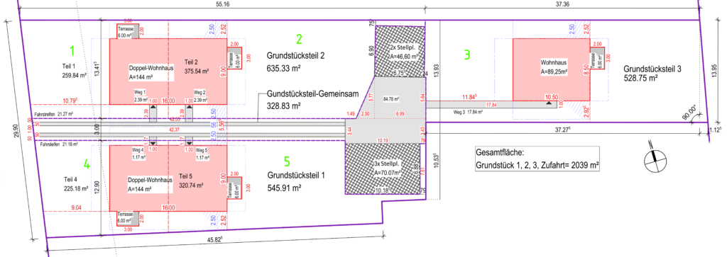 Das nach Zusammenführung etwa 2.039 m² große Gesamtgrundstück kann ideell (nach WEG) in fünf Teilgrundstücke geteilt werden.