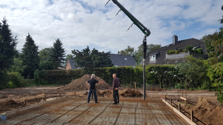 Dem Bauantrag wurde stattgegeben, die Baugenehmigung ist erteilt. Nach Wochen des Wartens kann es endlich weitergehen. Die Fundamentgräben werden gezogen, die Grundleitungen gelegt und schließlich die Sohle hergestellt.